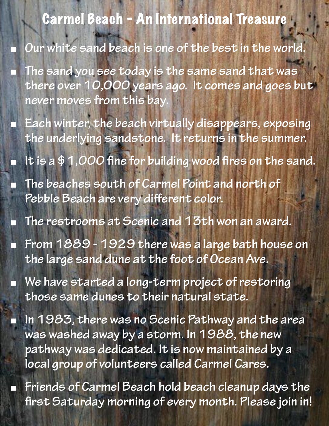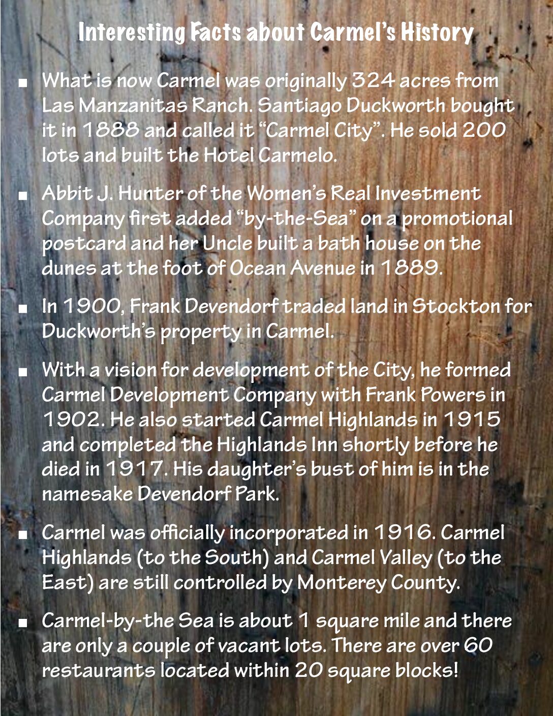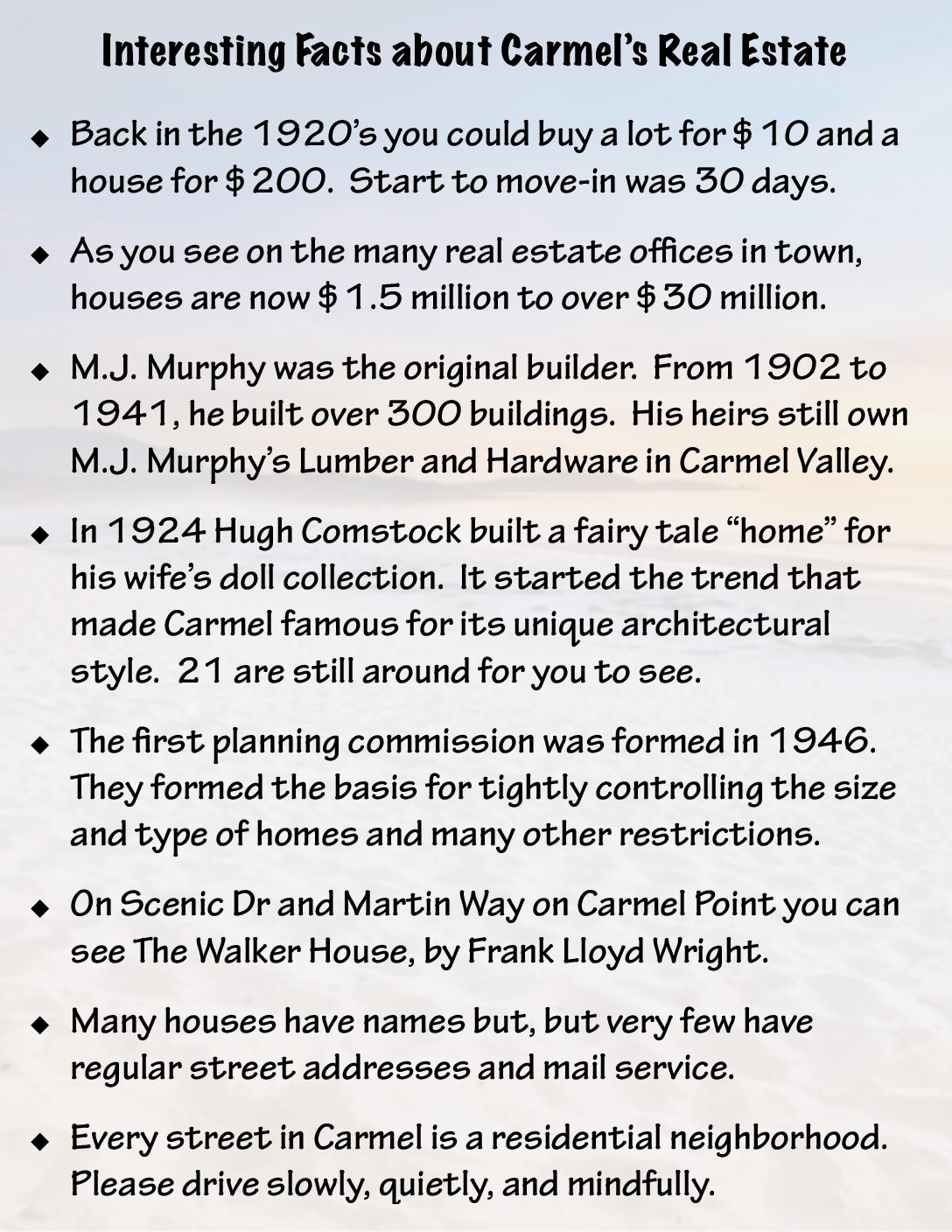 Following is a number of pages of Interesting Facts about the City of Carmel-by-the-Sea. These are just a sampling of things that make Carmel a special place that needs to be preserved.